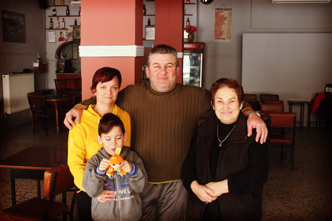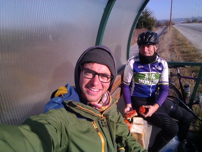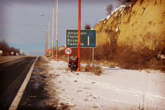Je pédale encore pour quelques jours avec Ryan et Carly (Compagnons de route taiwanais avec qui j’ai pédalé les 2 derniers mois) et nous traversons sans encombre la frontière. Je fête mon entrée en Europe par une crevaison et dois réparer dans le vent et le froid avant de pouvoir commencer à pédaler sur les routes grecques. Nous avons perdu du temps et il commence déjà à faire sombre. Nous prévoyons de nous arrêter à la première station service ou restaurant que nous apercevons pour y camper. Après 15km, nous apercevons enfin une station essence et demandons si nous pouvons y dormir mais on nous explique que la station ferme la nuit et ils ne peuvent pas nous laisser dormir à l’intérieur. Après 3 essais, nous finissons par convaincre un restaurant de nous laisser dormir dans une annexe. Les propriétaires sont très froids en apparence mais quelques minutes après notre arrivée, il nous font rentrer au chaud dans le restaurant, nous installent près du poêle, puis ils nous offrent un très bon café latte ainsi que des gâteaux et quiches fait-maison. A l’heure du dîner, nous demandons si nous pouvons utiliser la cuisine pour cuire nos pastas. La patronne refuse que nous entrions dans sa cuisine mais une demi-heure plus tard, elle revient avec nos pâtes, du pains, des légumes et une salade ! Pour nous accueillir en Grèce, son mari nous ouvre également une bouteille de vin ! Quel luxe de boire de l’alcool après 4 mois en Iran et Turquie ! Le lendemain matin, nous les remercions par un petit mot sur la traditionnelle carte postale que j’offre à mes hôtes. Ils nous offrent une fiole de Gin pour nous réchauffer et nous saluent derrière la fenêtre par de grands signes et un large sourire ! Comme quoi les rencontres dérident !