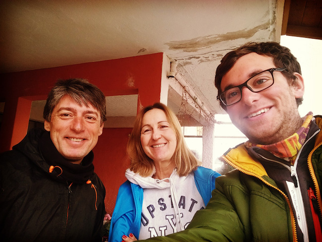 Nous quittons la ville et pédalons une quarantaine de kilomètres supplémentaires. La route grimpe sec, la route elle-même est dégagée mais les bas côté sont recouverts d’une belle épaisseur de neige. Il n’y a nulle part où s’arrêter et dormir. Juste de la montagne. Dans la soirée, alors que la nuit s’installe déjà nous apercevons une sortie avec deux villages fléchés. Sortis de l’autoroute depuis déjà 2 km, nous n’apercevons toujours aucun signe de présence humaine. Puis finalement un petit village sur une colline avec une croix blanche en néon qui traine en haut du clocher. Nous commençons à frapper aux portes que nous apercevons de la lumière. Après une dizaine de portes frappées, nous avons essayés que des refus, de l’indifférence et parfois du refus. On nous a claqué la porte au nez et j’ai eu peur que l’un d’entre eux ne sorte pas avec son fusil. Nous avons du nous résigner à camper devant l’église. Ryan et Carly peuvent utiliser leur tente (autoportante) et je m’installe dans le clocher dont la porte est restée ouverte par chance…